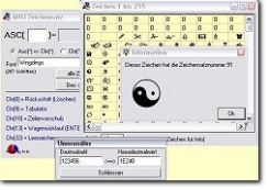 Zeigt den ASC(?) Code zu CHR(?) Code und umgedreht an. Wahl der Schrift. Anzeige aller Zeichen von 1 bis 255 mit Kopierfunktion in die Zwischenablage.