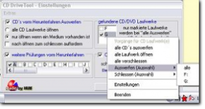 PC aus, CD-ROM drin! Was nun? Wenn Sie sicher stellen wollen, dass keine CD mehr im Laufwerk ist wenn Sie den Rechner verlassen, dann hilft Ihnen dieses Tool. Das Tool kontrolliert beim Beenden von Windows, ob sich noch eine CD im Laufwerk befindet und wirft diese optional bei Bedarf aus. Zudem können Sie über ein kleines Menü alle CD Laufwerke geöffnet oder geschlossen werden.