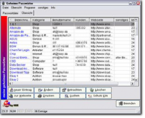 Verwalten und Schützen Sie ihre Passwörter für das WWW und andere Zugangsdaten mit nur einem Master Passwort. Speichern Sie Benutzername, Kennwort, gemeldete Emailadresse, Webseite und weitere Informationen in einer verschlüsselten Passwortdatei. Ihre Kennwörter sehen Sie in einer Übersicht wo auch der direkte Zugriff auf die jeweilige Webseite möglich ist. Der Zugang zu den Passwortdateien wird mittels Benutzername und Master Passwort geschützt, ein zeitliches automatisches Schließen der Passwortdatei ist möglich. Es können unbegrenzt viele Passwortdateien angelegt werden. Auch das Drucken, Kopieren in die Zwischenablage und nachträgliches ändern ist jederzeit möglich. Manipulationen an einzelnen Datensätzen werden ausgefiltert. Inklusive eines Passwort Generators für bis zu 50 Zeichen.
