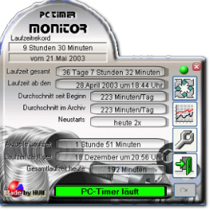Mit diesem Programm können Sie endlich sehen, wie lange Ihr PC läuft. Das Programm besteht aus zwei Teilen. Der erste Teil (PCTimer.exe) startet immer mit dem Einschalten des PCs (Autostart-Verzeichnis) das zweite Programm (Monitor.exe) zeigt die Gesamtlaufzeit, den derzeitigen und den längsten Lauf sowie den Tagesdurchschnitt. Im Task-Manager kann die Aktuelle Laufzeit ständig angezeigt werden. Inklusive einem Zeitarchiv und Kindersicherung (in Windows NT und 2000 nur Teilweise einsetzbar) - Die Kindersicherung, läst den PC erst zu einer bestimmten Zeit Starten und/oder fährt ihn herunter, gleichfalls können Internetverbindungen ab einer Uhrzeit getrennt werden.